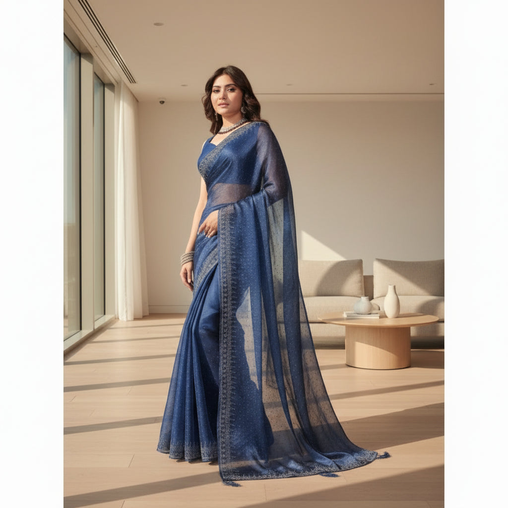 CQ Women's Jimmy choo Embellished Bollywood Saree With Unstitched Blouse 5.5Mtr (Blue)